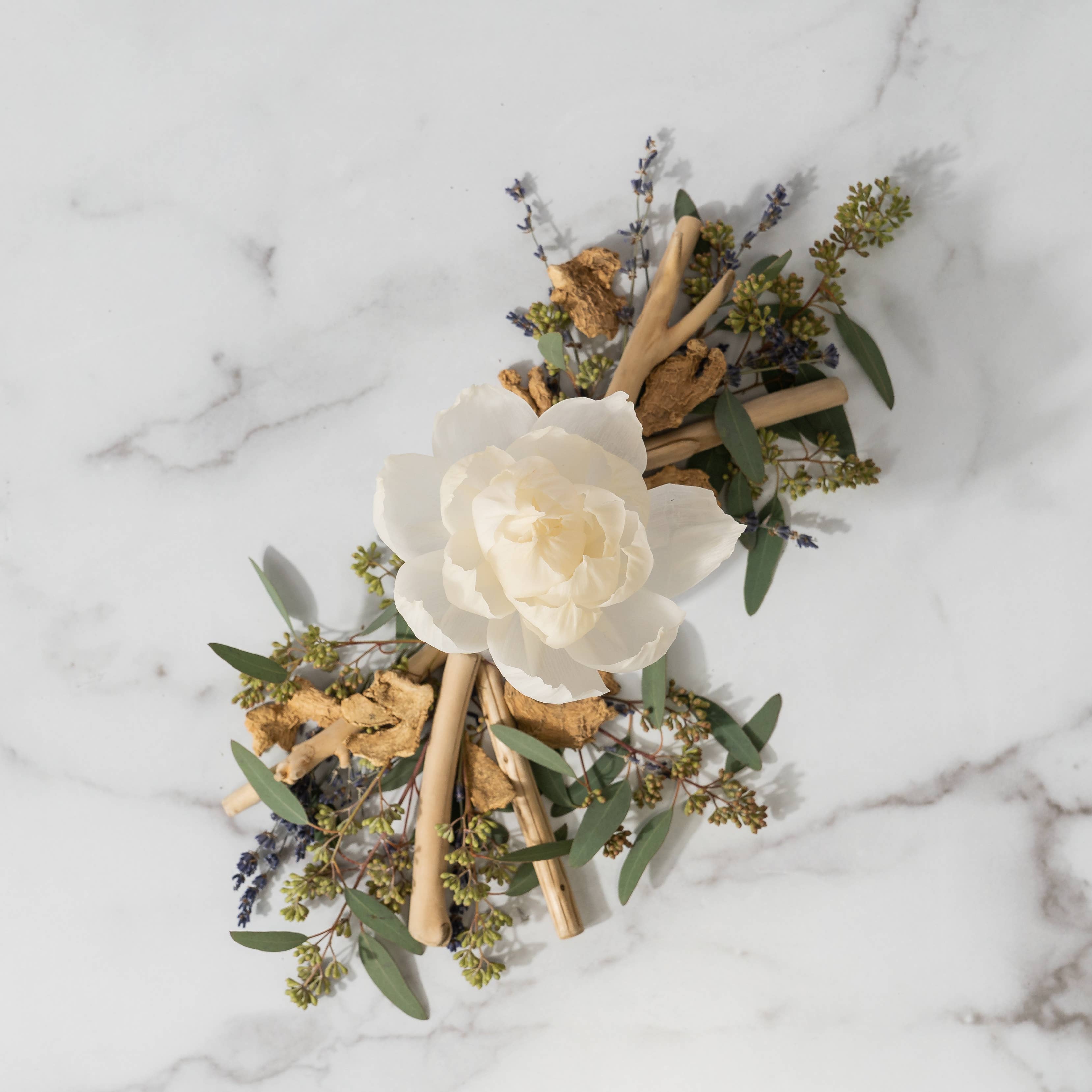 Our flower diffuser includes your favorite Greenleaf fragrance oil and a sola paper flower that emits a beautiful, blooming scent for up to 60 days! As the fragrance oils are absorbed through the wick, the flower begins to “bloom,” slowly emitting the fragrance and eventually resembling real flower petals. With the neutral color of the oil and the large flower, it will enhance and complement any space.