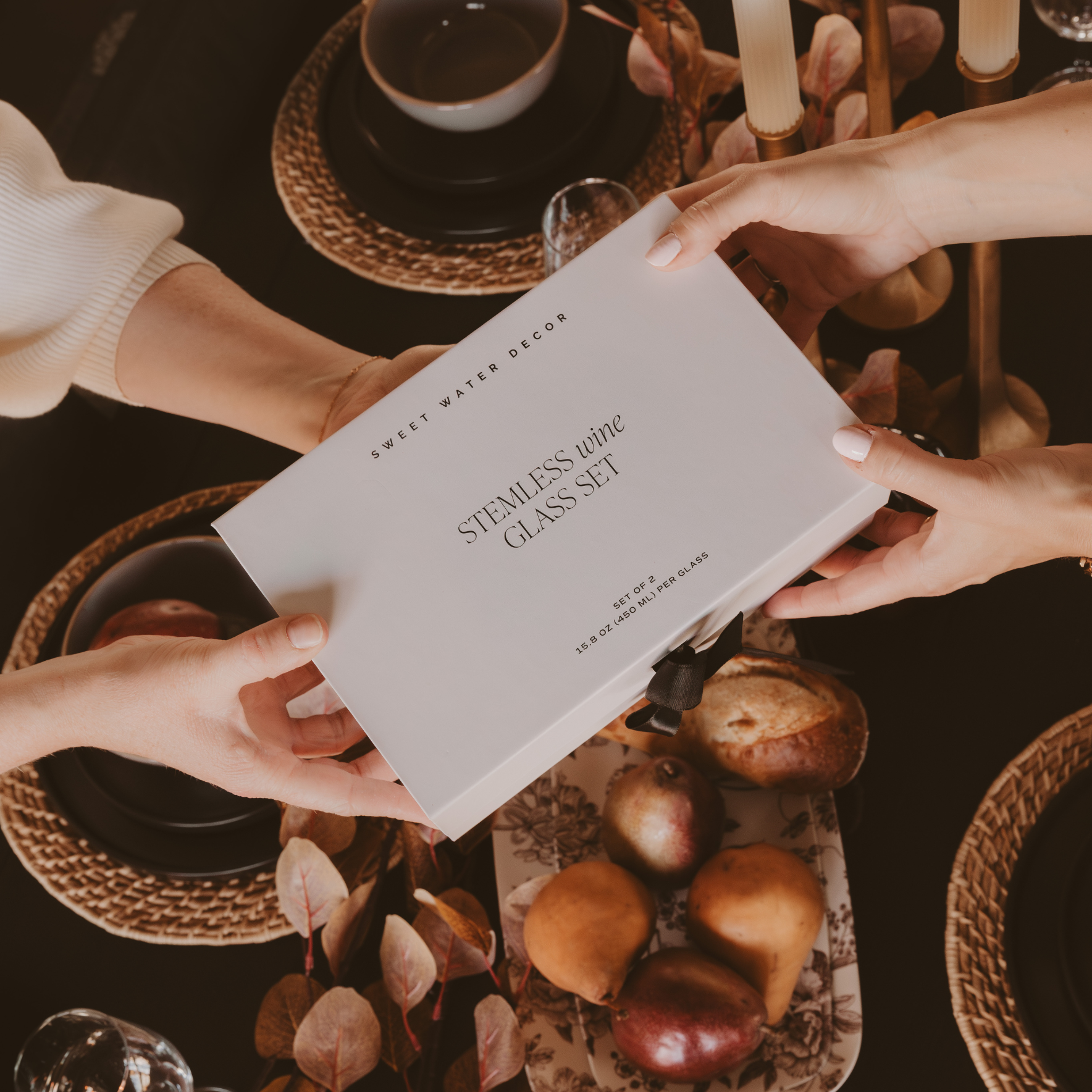 Elevate your seasonal assortment with our Boxed Set of 2 Stemless Wine Glasses, featuring a timeless Delft-inspired design and delicate gold floral details. Beautifully packaged in a premium gift box with a satin ribbon tie, this set is perfect for Fall gatherings, Thanksgiving tables, and Autumn hostess gifts. A versatile, elegant addition your customers will love all season long. DETAILS: • 15.5oz Stemless Glassware - Soda-Lime Glass • Set of 2 Wine Glasses • Box Size: 9.2" W x 5.9" D x 3.9" H • Satin Ribbon Tie Closure on Box • Size: Top: 2.6" Widest: 3.3" Height: 4.5" • Real Gold Foil Detailing • Delft Design • Safe for Hot and Cold Beverages • Designed in the USA, Imported • Style No. WG020 WINE GLASS CARE: • Hand Wash Only • Do Not Microwave • Wash Before Use and Avoid Abrasive Cloths When Cleaning