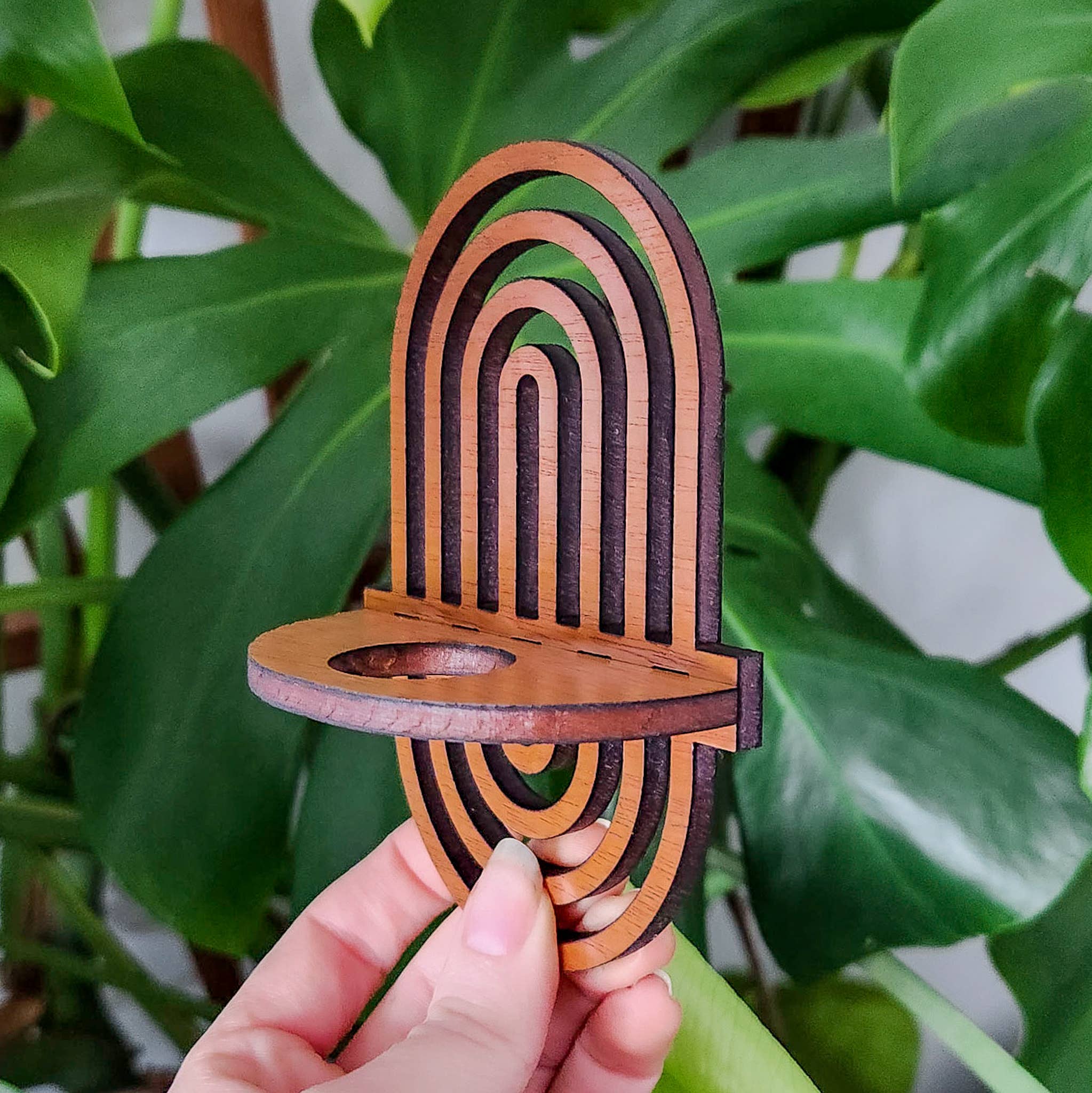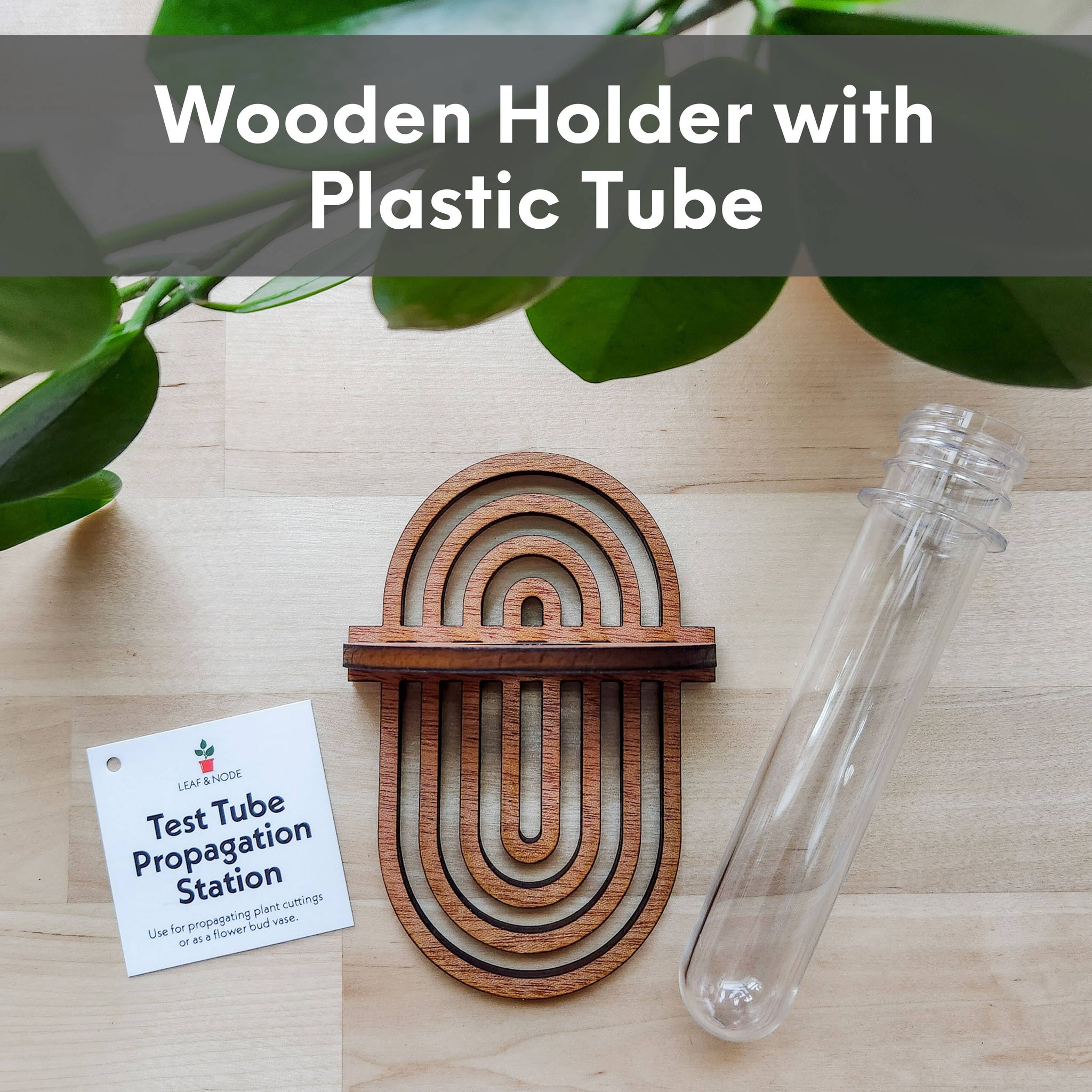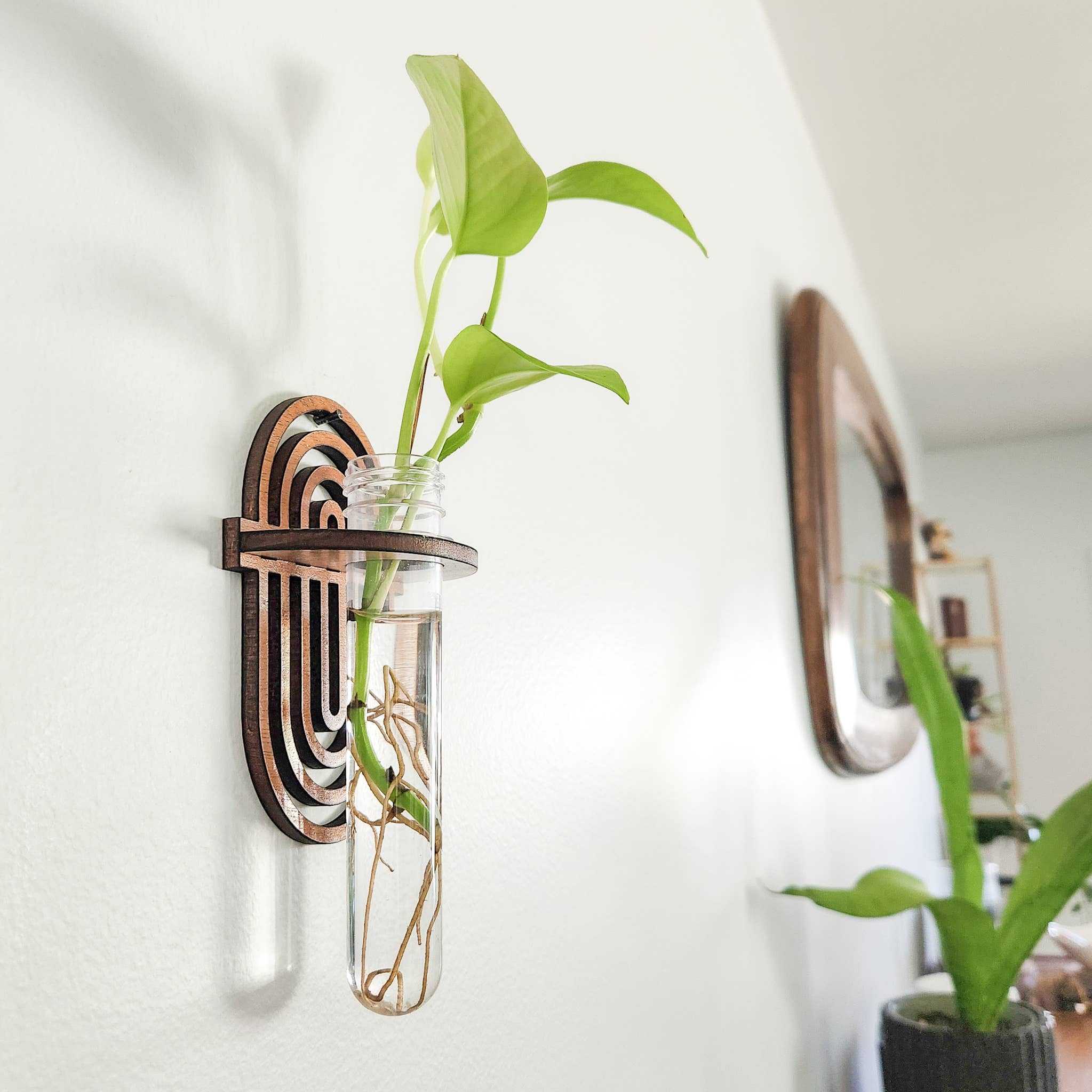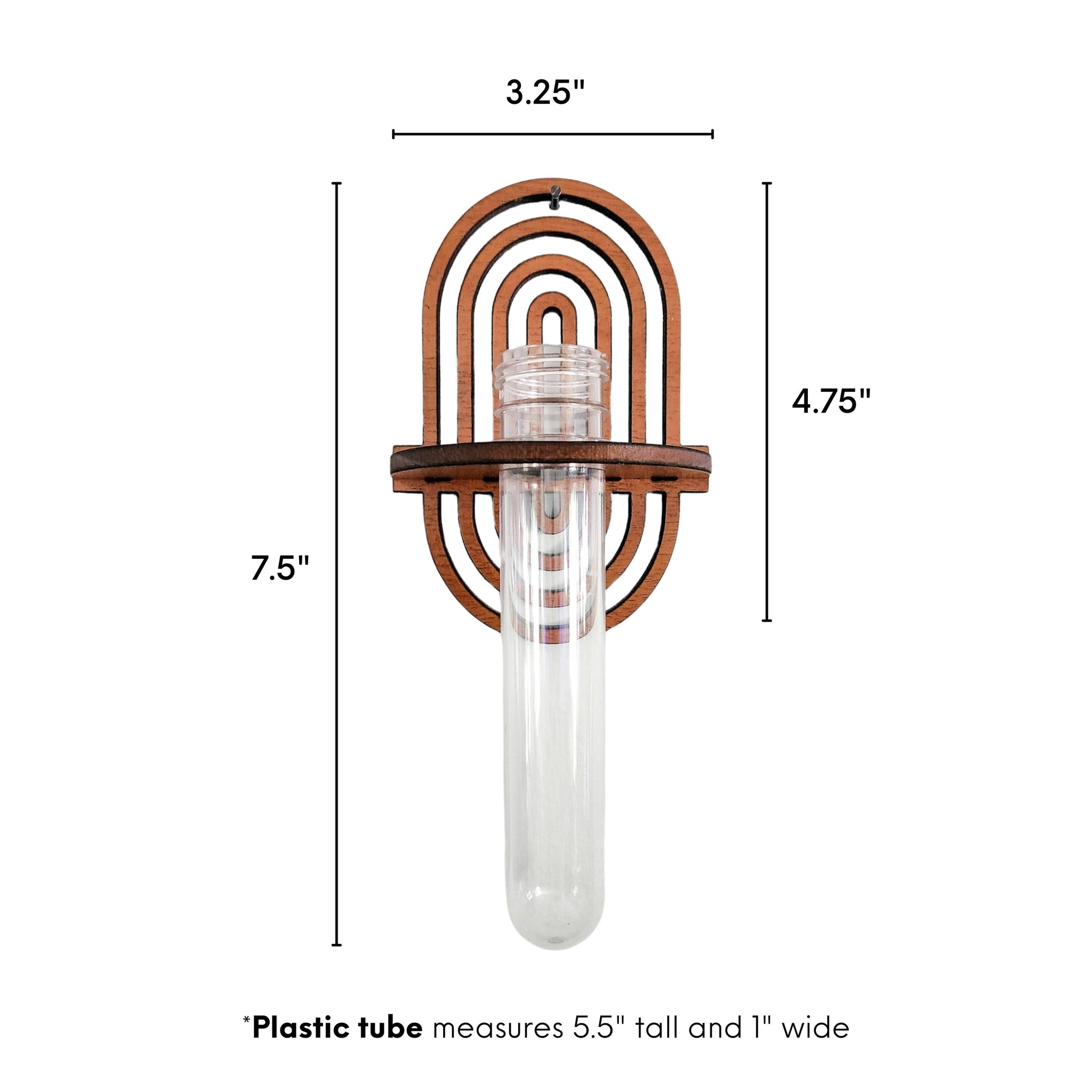 Customers love our hanging propagation stations that can be mounted to their walls, and we're confident they'll sell well in your shop, too! Plant lovers enjoy watching roots grow on their plant cuttings in the clear test tube. These small, rainbow shaped test tube planters are lightweight so they can be hung on a nail or using nail-free options. The minimalist design blends beautifully with a variety of home décor styles. Many customers display multiple grouped together for a bigger, propagation wall statement piece. See size information below: - Wooden Test Tube Holder: 4.75 in. tall x 3.25 in. wide - Plastic Test Tube: 5.5 in. tall x 1 in. wide - Total Height Assembled: 7.5 inches tall (measurements are approximate and vary slightly) This item is handmade from mahogany plywood with a warm brown tone. The material can be damaged by moisture.