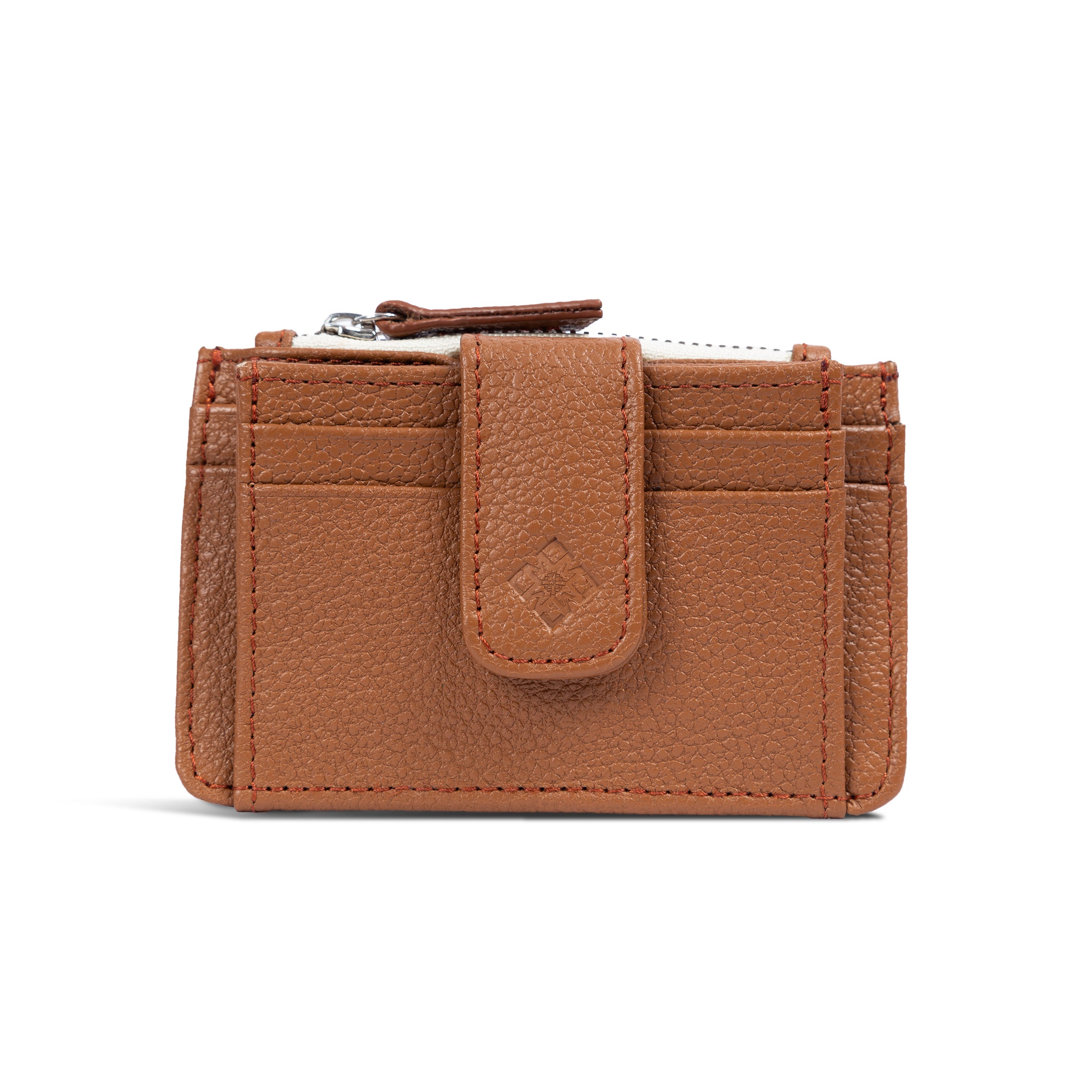 This card case features six slots for storing cards, one back slip pocket, and a top zip pocket for coins. Securely stored in place with one snap button closure belt.