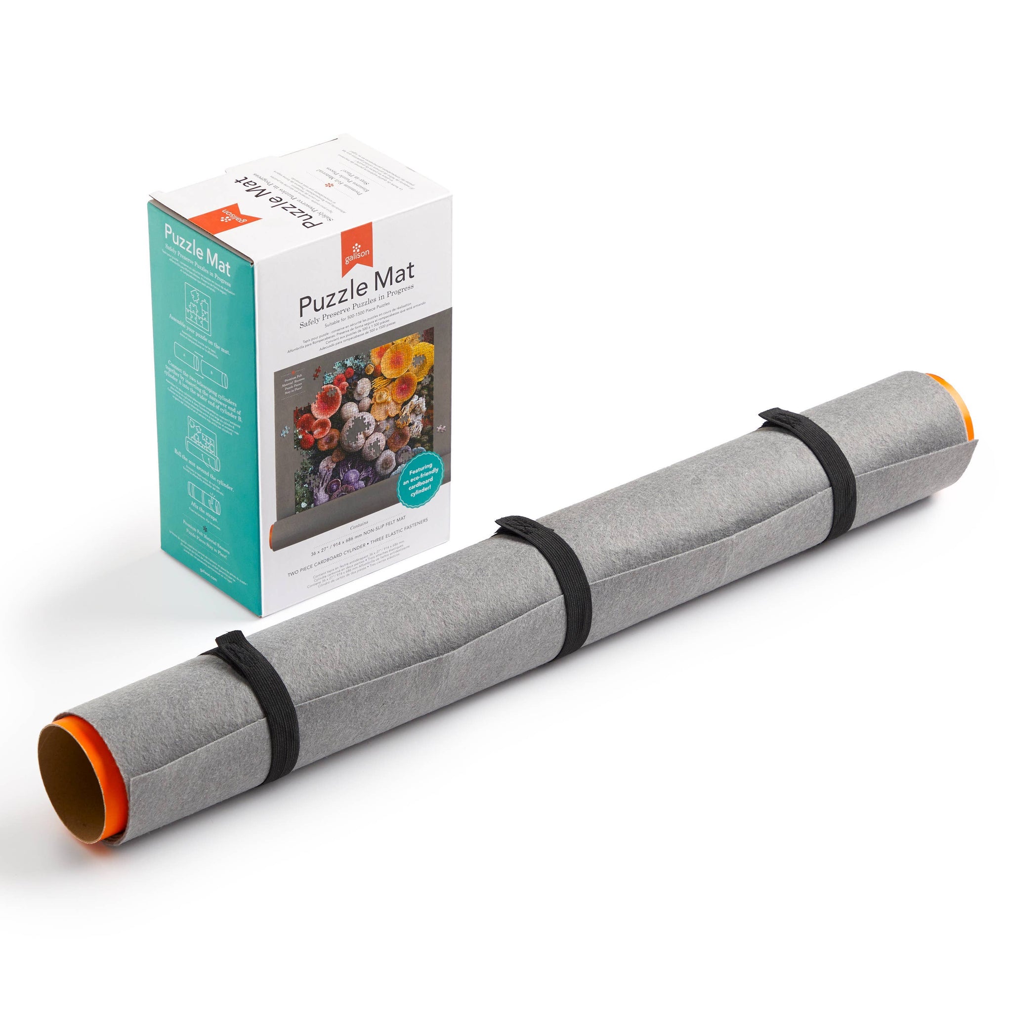 The Puzzle Mat by Galison will safely preserve your puzzles in progress. Premium felt fabric ensures your puzzle pieces stay in place so never lose a puzzle piece again! Included is a non-slip felt mat, two piece cardboard cylinder and three elastic straps. • Non-slip felt mat: 36 x 27”, 914 x 685 mm • 3 elastic straps • Two piece cardboard cylinder for storing puzzle pieces on the go! • Made by Galison with our puzzle fans!