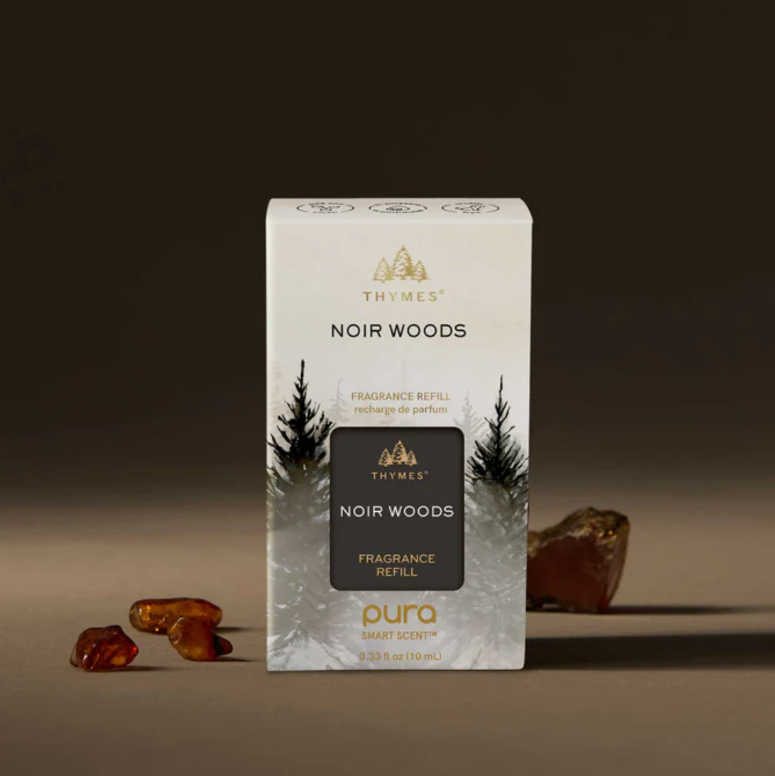 NOIR WOODS: smoky wood, fresh evergreen, and golden amber for a warm, grounding fragrance experience that feels both elevated and inviting.